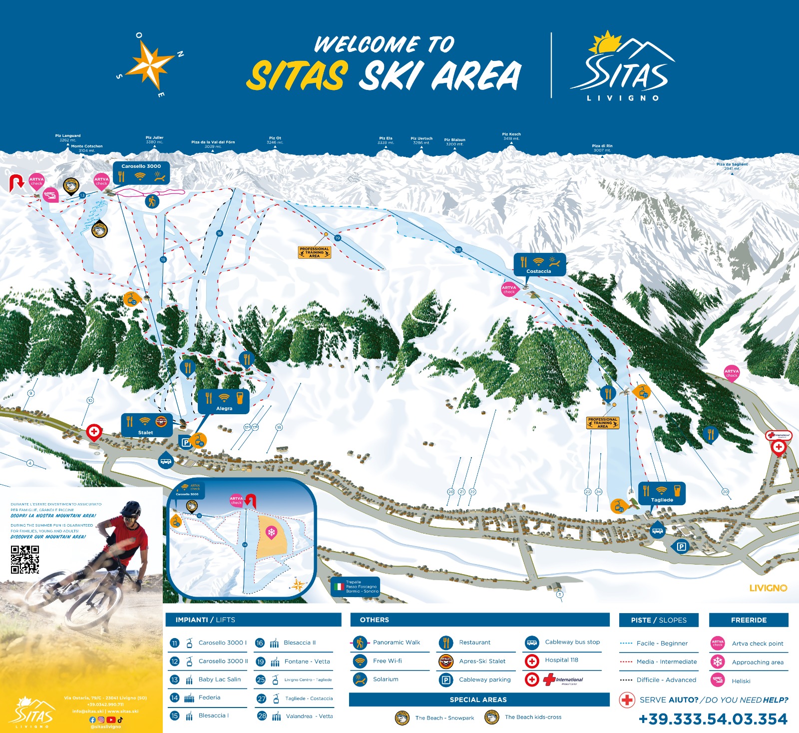 The Sitas Ski Area has a total of 14 different slopes of varying difficulty levels. 6 easy slopes (blue), 7 medium slopes (red) and 1 difficult slope (black) will allow you to make your ski trip as tough and demanding or relaxing and fun as you like. The slopes stretch from the level of the town up to around 2700m above sea level. The Ski Area is therefore varied and dynamic, suitable for the skill levels and tastes of all different skiers. Everyone, from the most demanding experts to children and beginners, will find slopes suitable for them at Sitas. Below is a summary table of the useful information about our slopes (name, difficulty and drop).